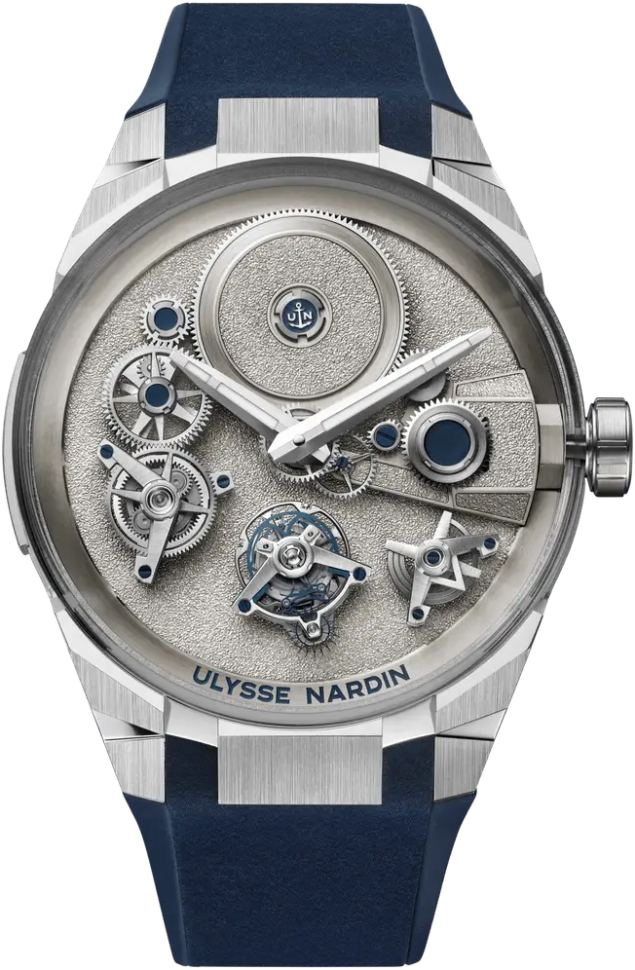Новая лимитированная коллекция от Ulysse Nardin поражает авангардным дизайном: «плавающий» механизм, футуристичный и как будто почти невесомый циферблат из мельхиора. Калибр UN-176 с ручным заводом и 7-дневным запасом хода, парящий турбийон и индикатор запаса хода демонстрируют высокий уровень часового мастерства.