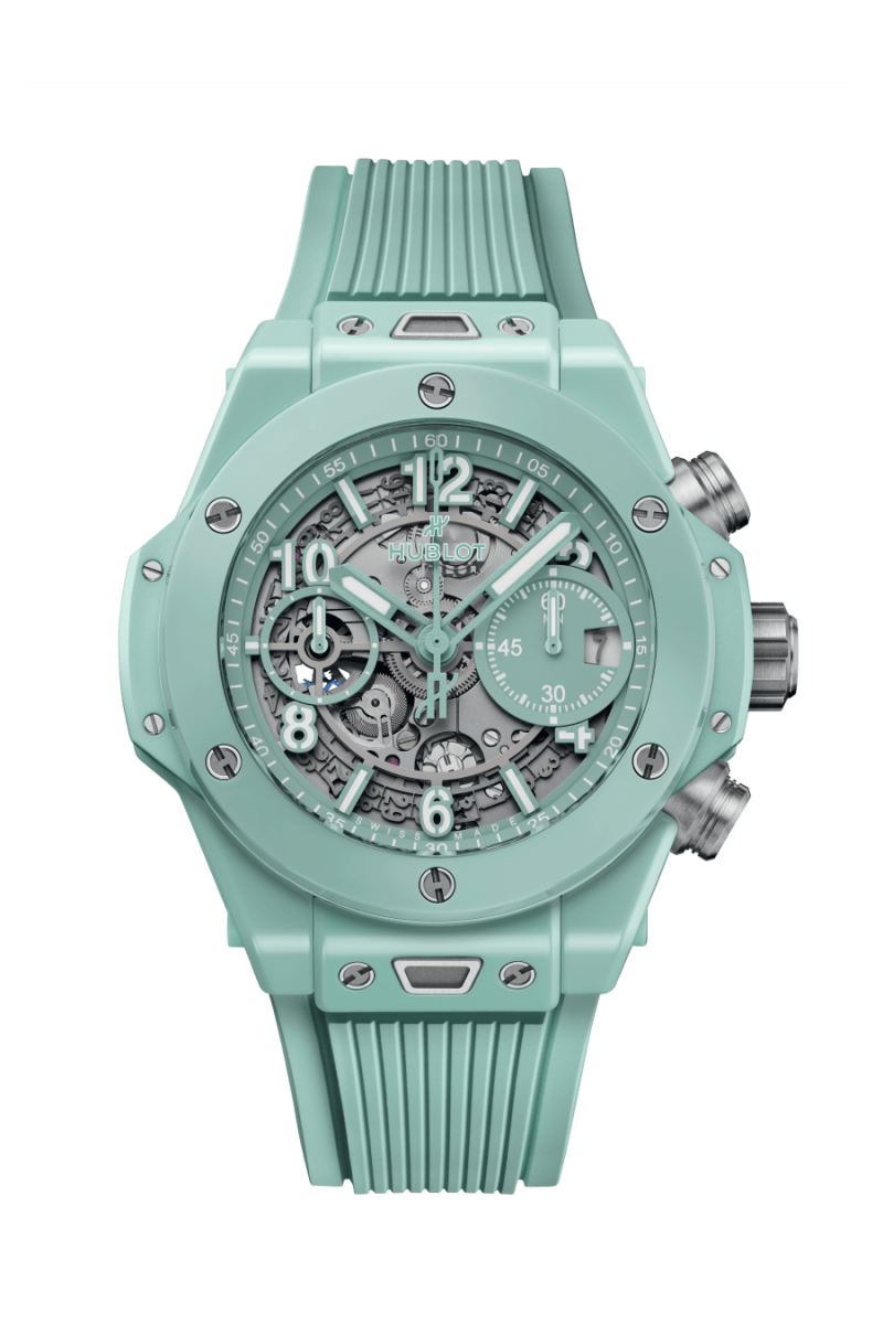Скелетонизированный циферблат и мятно-зеленый каучуковый ремешок придают модели современный и яркий вид. С запасом хода 72 часа и титановой раскладывающейся застежкой, эти часы станут отличным дополнением к коллекции любителей Hublot.