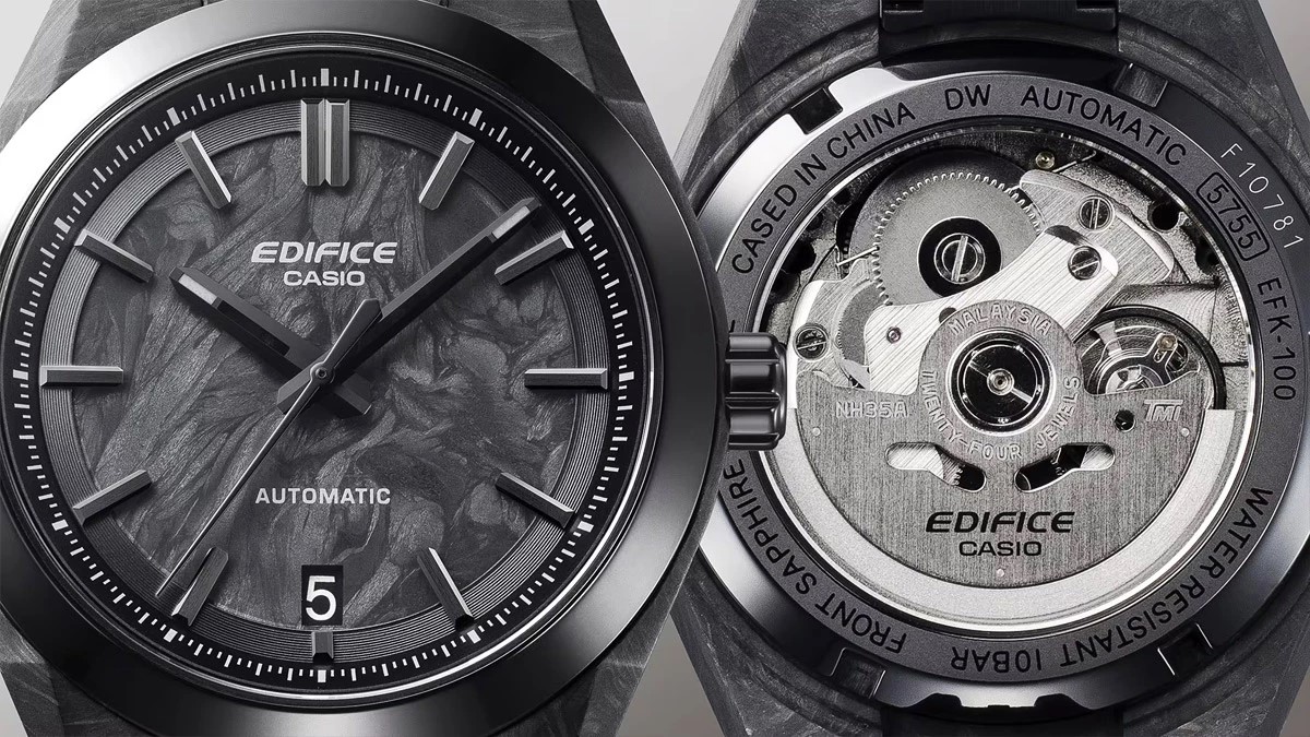 Исторический релиз 2025 года: Casio Edifice EFK-100 — первые механические часы бренда с карбоновым корпусом и полимерным ремешком. Модель отличается темным циферблатом из кованого карбона под сверхпрочным сапфировым стеклом. Внутри — 24-каменный механизм с частотой 21600 колебаний в час, 40-часовым запасом хода.