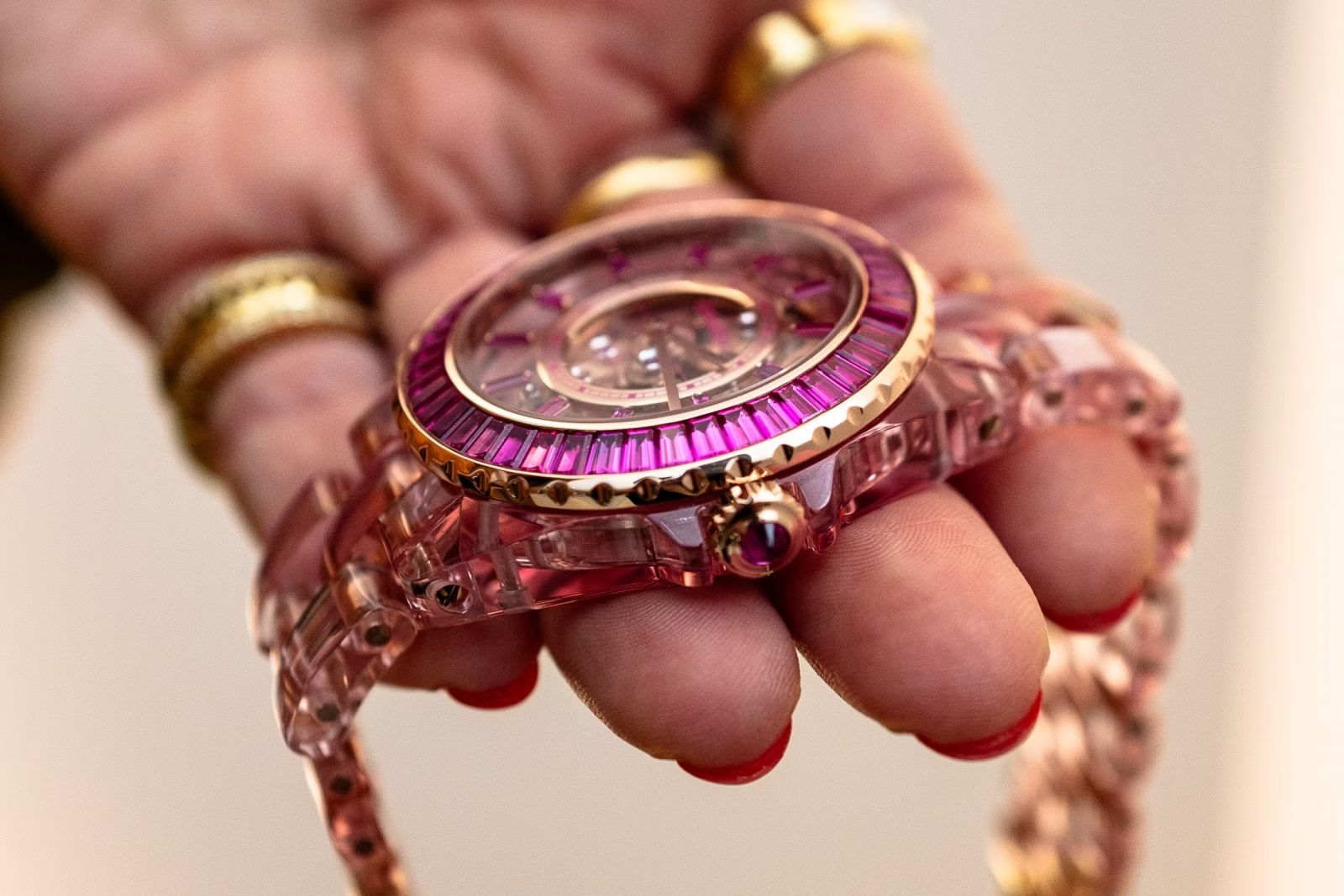 Золотой корпус, прозрачный корпус, ажурный дизайн с яркой фуксией в оформлении — эти часы от Chanel настолько же яркие и кричащие, насколько нежные и загадочные. Сапфир на заводной головке — отдельный акцент, за который цепляется взгляд.
