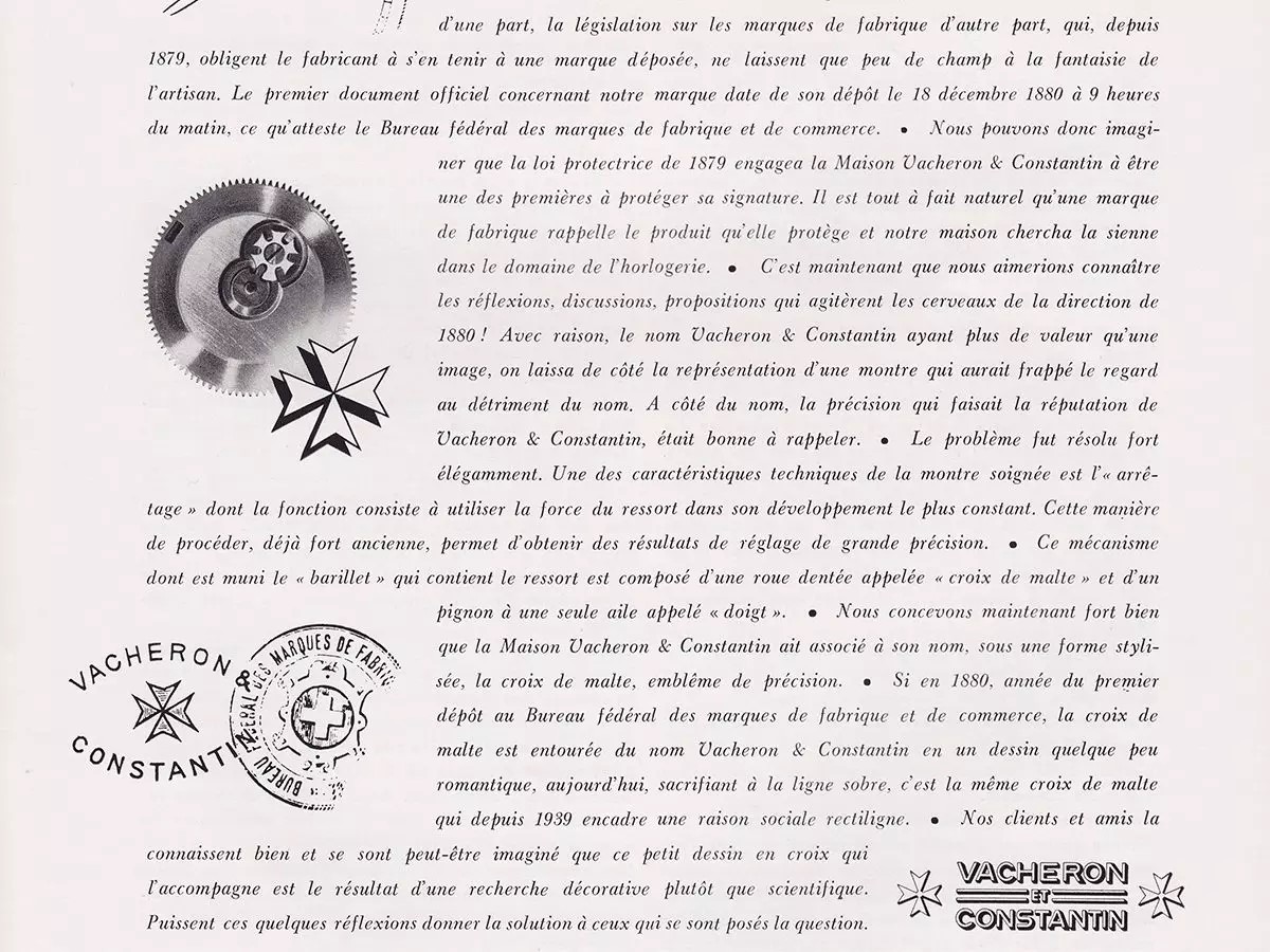 В 1877 году Vacheron & Constantin, Fabricants, Geneve стало официальным названием компании. Вскоре на ее логотипе появился мальтийский крест, который используется и по сей день. Декор символичен, он вдохновлен формой компонента часового механизма крестообразной формы, который используется для ограничения натяжения основной пружины.