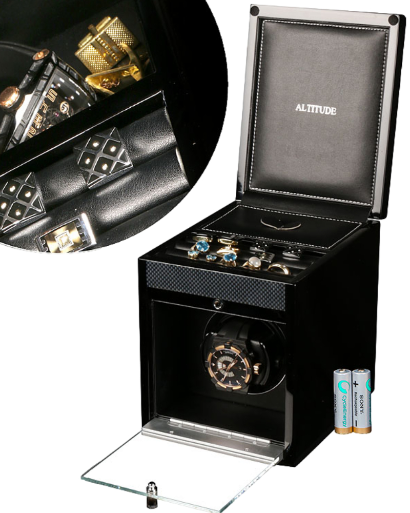 Шкатулка изготавливается из благородного черного дерева «венге», высокотехнологичного карбона, стекла и полированного металла. Декоративная вставка — карбон. Деревянные элементы покрыты множественными слоями рояльного лака. Внутренние поверхности выстлана эко-кожей чёрного цвета. "Стакан" аллюминиевый. В верхней части расположено дополнительное отделение, украшенное логотипом «Altitude», которое можно использовать для обычного хранения наручных часов небольшого размера и ювелирных украшений. Светодиодная подсветка с функцией включения/выключения. Основное предназначение шкатулки — автоматических подзавод 1 часов. Питание от сети 220 вольт или 2 батареек класса АА. В комплекте адаптер, салфетка, держатель для часов. Инструкция на русском языке. Упакована в фирменную белую картонную коробку с ручкой.