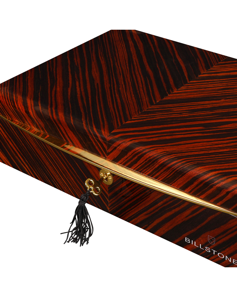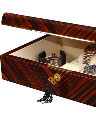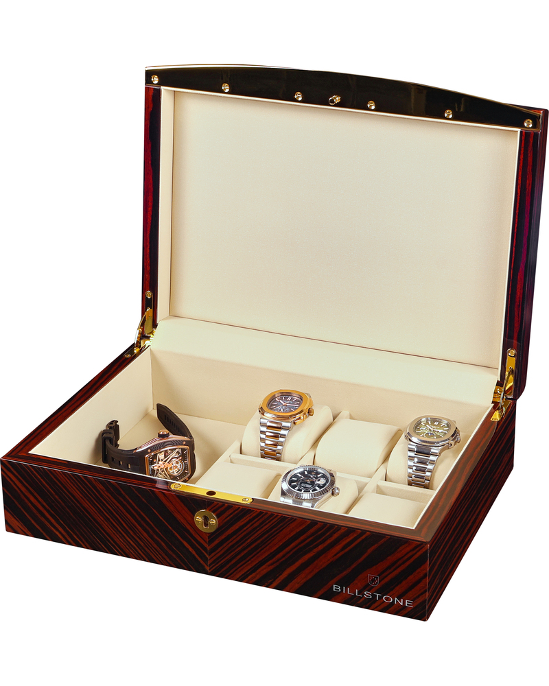 Классическая шкатулка от бренда Billstone. Непревзойденный корпус выполнен из дерева Макассар, покрытого множественными слоями рояльного лака. Золотая фурнитура шкатулки подчеркивает уникальность и премиальность использованных материалов. Открывая крышку шкатулки, можно созерцать коллекцию из 6-ти наручных часов на мягких бежевых подушечках. В интерьере используются светло-бежевый велюр, который идеально сочетается с экстерьером бокса. Для сохранности содержимого шкатулки есть замочек, который закрывается на ключ. В фирменной темной коробке шкатулка идеально подойдет для подарка.