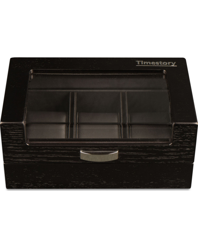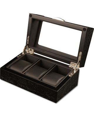 Через загнутое прозрачное стекло в крышке можно любоваться коллекцией из 3-х часов. Исполнение в черном дереве Бубинга является классикой, а покрытие множественными слоями высококачественного лака придает изящность. В дополнении к элегантности шкатулки черное дерево переходит в приятный кожаный интерьер аналогичного цвета. Эргономичные подушки позволят с максимальным комфортом и удобством застегнуть на них часы любых размеров.