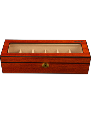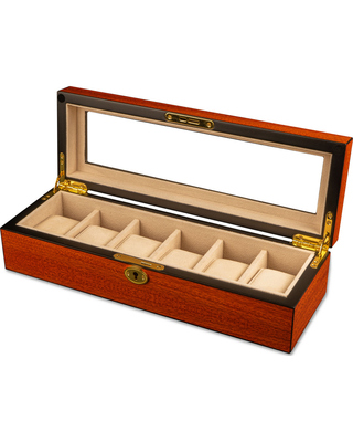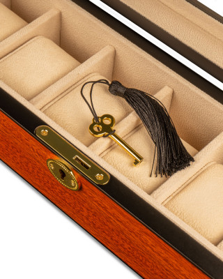 Исполнение экстерьера в дереве является классикой, а покрытие множественными слоями высококачественного матового лака придает изящность. Демонстрируя свои часы через крышку, нужно не забывать про их сохранность. Обеспечить ее позволяет небольшой замочек на торцевой части, закрывающийся на ключ. Использование приятного бархата в интерьере светлого-бежевого оттенка не оставит вас быть равнодушными. Эргономичные подушки позволят с максимальным комфортом и удобством застегнуть на них часы любых размеров.