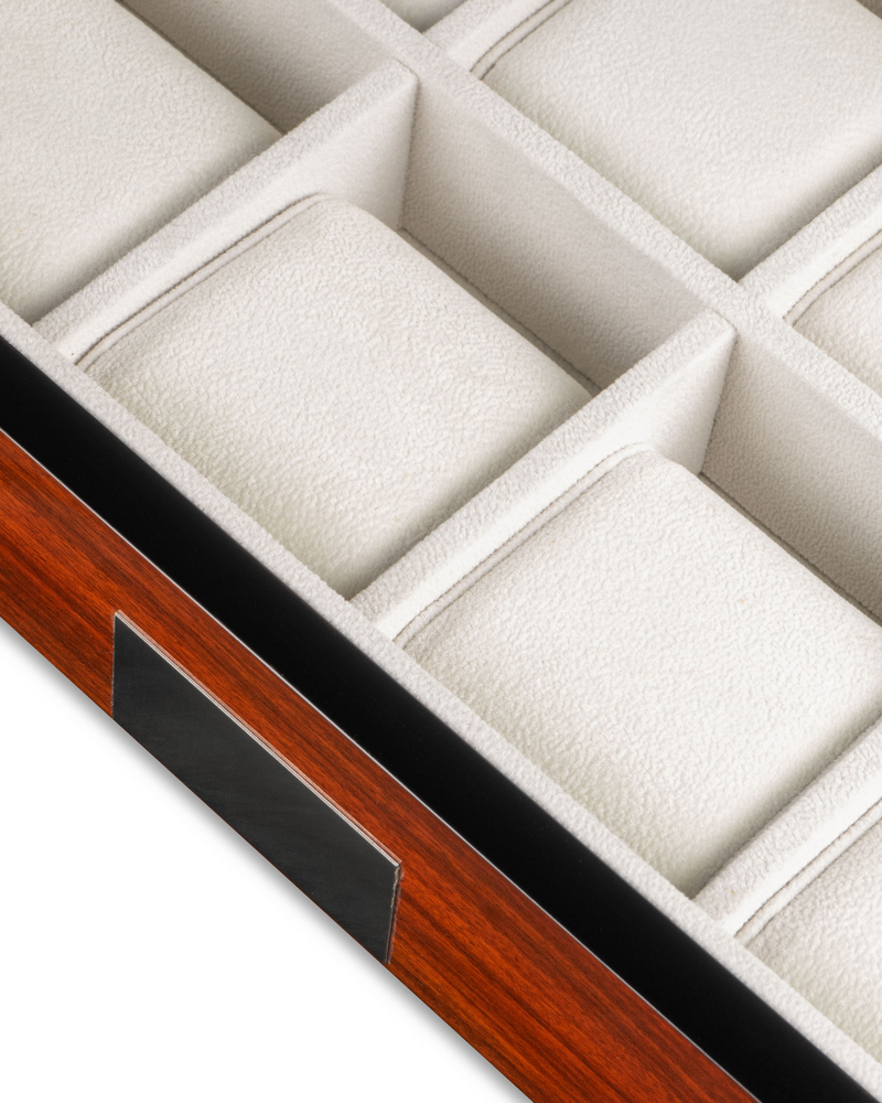 Открывая крышку шкатулки легким движением руки, можно любоваться коллекцией из 8-ми часов. Исполнение экстерьера в дереве Амбойна является редкостью, а покрытие множественными слоями высококачественного лака придает изящность. Элегантность в интерьере дополняет приятный бархат светлого оттенка. Эргономичные подушки позволят с максимальным комфортом и удобством застегнуть на них часы любых размеров.