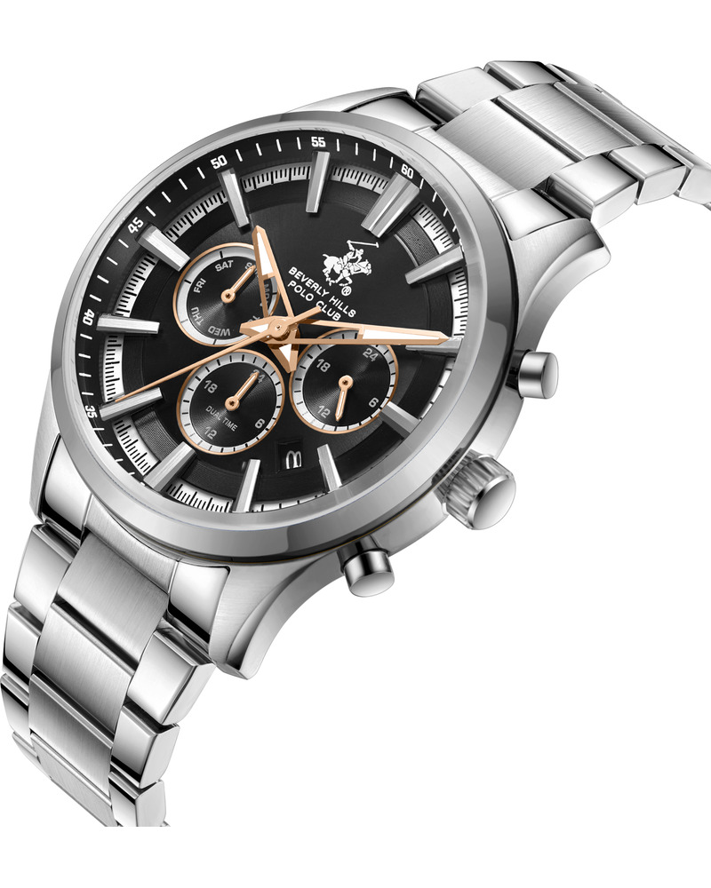 Предлагаем купить наручные часы Beverly Hills Polo Club BP3779X.350 в г. Москва. Это мужские часы. Водозащита до 50 метров позволит принимать душ или умываться, не снимая часов. Надежное сапфировое стекло противостоит появлению царапин. Сапфировое стекло используется в дорогостоящих изделиях, это лучшее стекло для наручных часов, которое не царапается при механическом воздействии, его можно повредить только алмазом. Корпус часов изготовлен из стали, механизм — кварц. Кварцевые часы всегда точнее механических. В среднем, погрешность хода составляет 20 секунд в месяц. Кварцевые часы не нужно заводить, только менять батарейку раз в несколько лет.