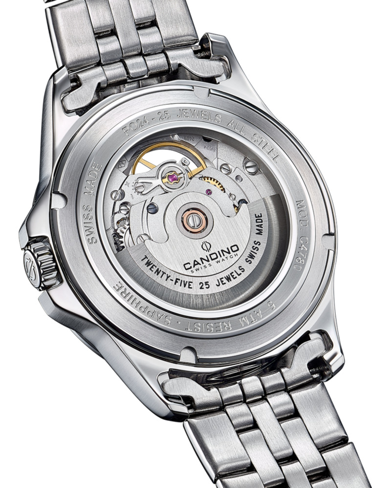 Предлагаем купить наручные часы Candino C4780/5 в г. Москва. Это классические мужские часы из коллекции Gents Automatic. Водозащита до 50 метров позволит принимать душ или умываться, не снимая часов. Надежное сапфировое стекло противостоит появлению царапин. Сапфировое стекло используется в дорогостоящих изделиях, это лучшее стекло для наручных часов, которое не царапается при механическом воздействии, его можно повредить только алмазом. Корпус часов изготовлен из стали, механизм — автоподзавод. В часах с автоподзаводом заводная головка практически не используется, что исключает истирание ее материала и материала корпуса (зазор между ними остается постоянным – это препятствует попаданию внутрь влаги, пыли, грязи).