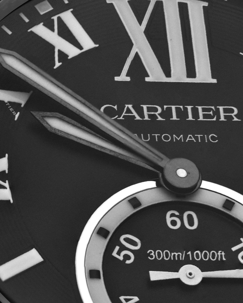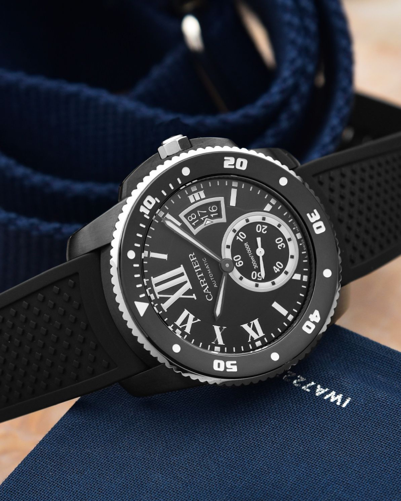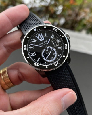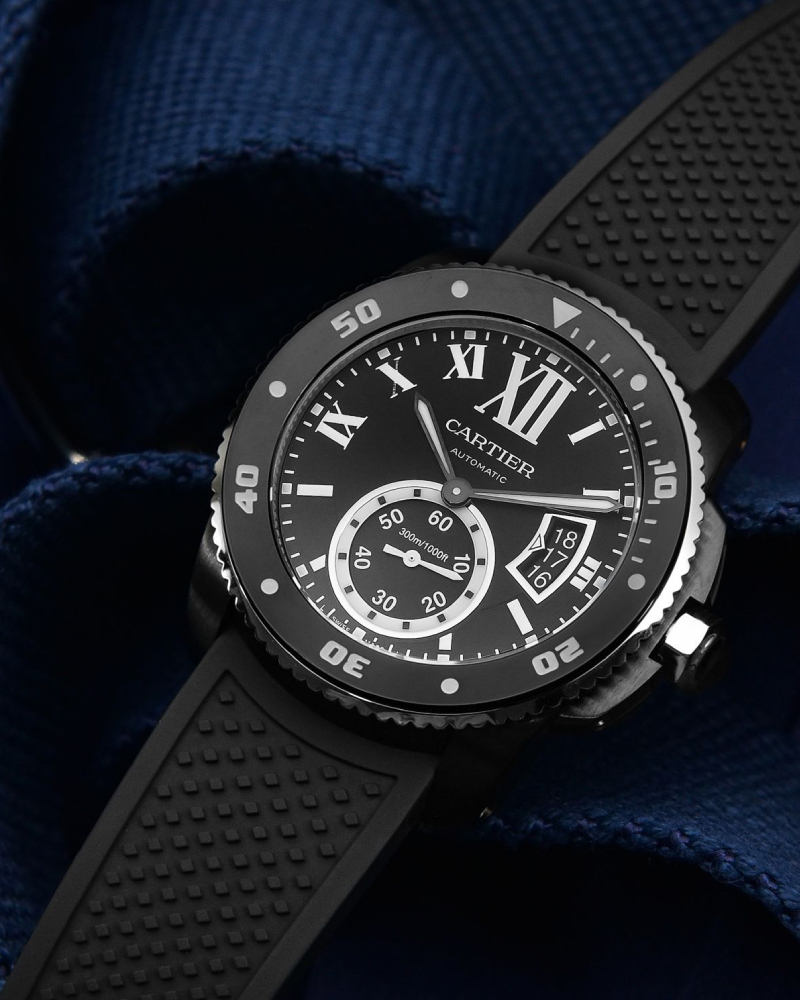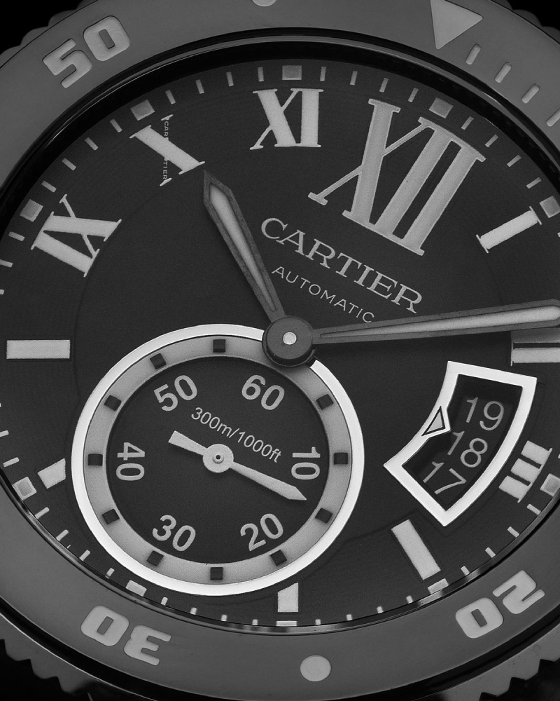Часы Calibre de Cartier Diver Carbone, механизм с автоматическим подзаводом, калибр 1904-PS MC. Корпус из стали с ADLC-покрытием, ободок из стали с ADLC-покрытием, индикатор с покрытием Super-LumiNova*, граненая заводная головка украшена граненой синтетической шпинелью. Черный циферблат, частично покрытый спиралевидным узором, индикаторы с покрытием Super-LumiNova*, стрелки в форме мечей из стали с покрытием Super-LumiNova*. Сапфировое стекло. Браслет из каучука, стандартная застежка из стали с ADLC-покрытием. Размеры корпуса: диаметр 42 мм, высота 11 мм. Водонепроницаемость до 30 бар (300 метров). (*Торговая марка Super-LumiNova не принадлежит Cartier.)
