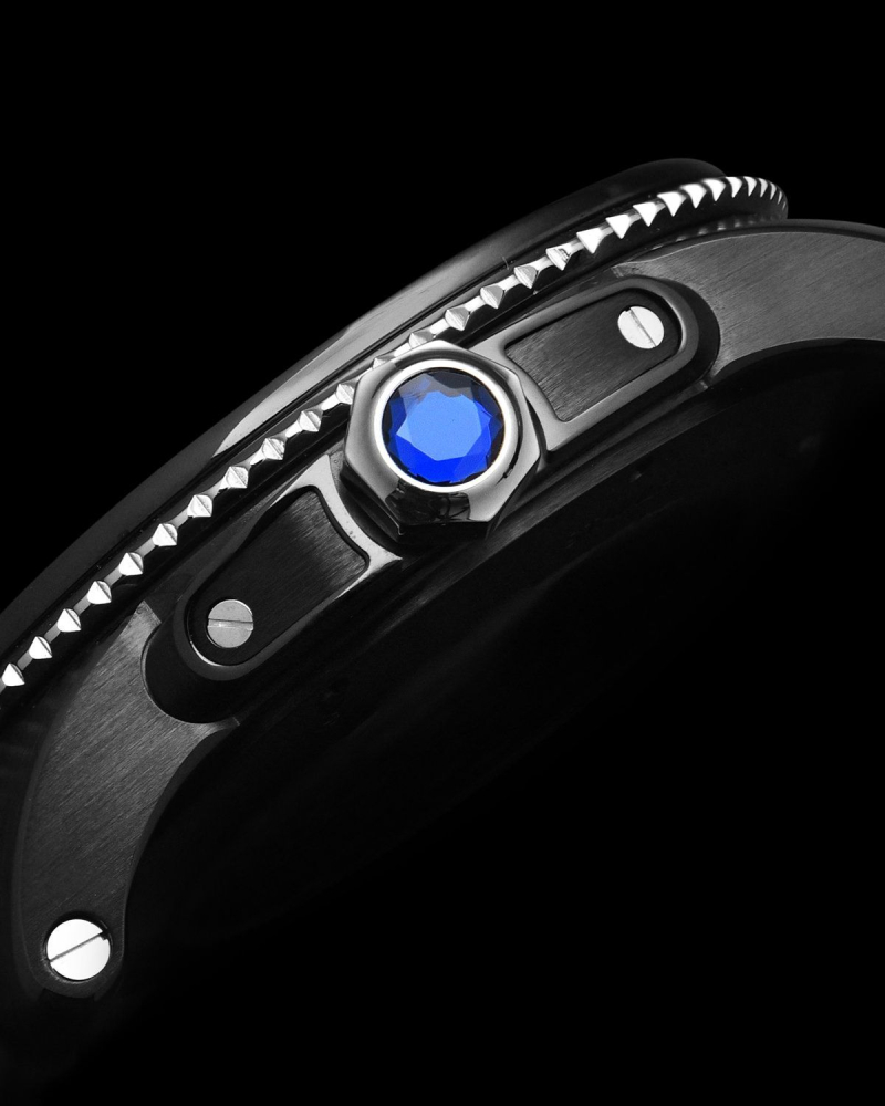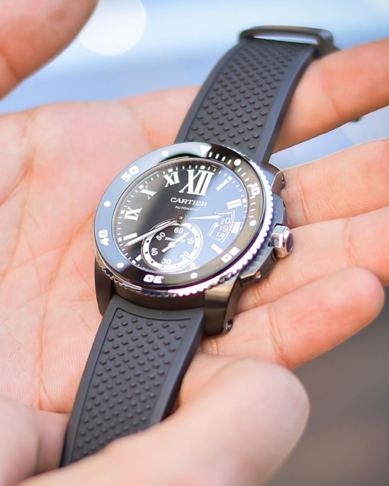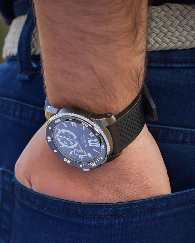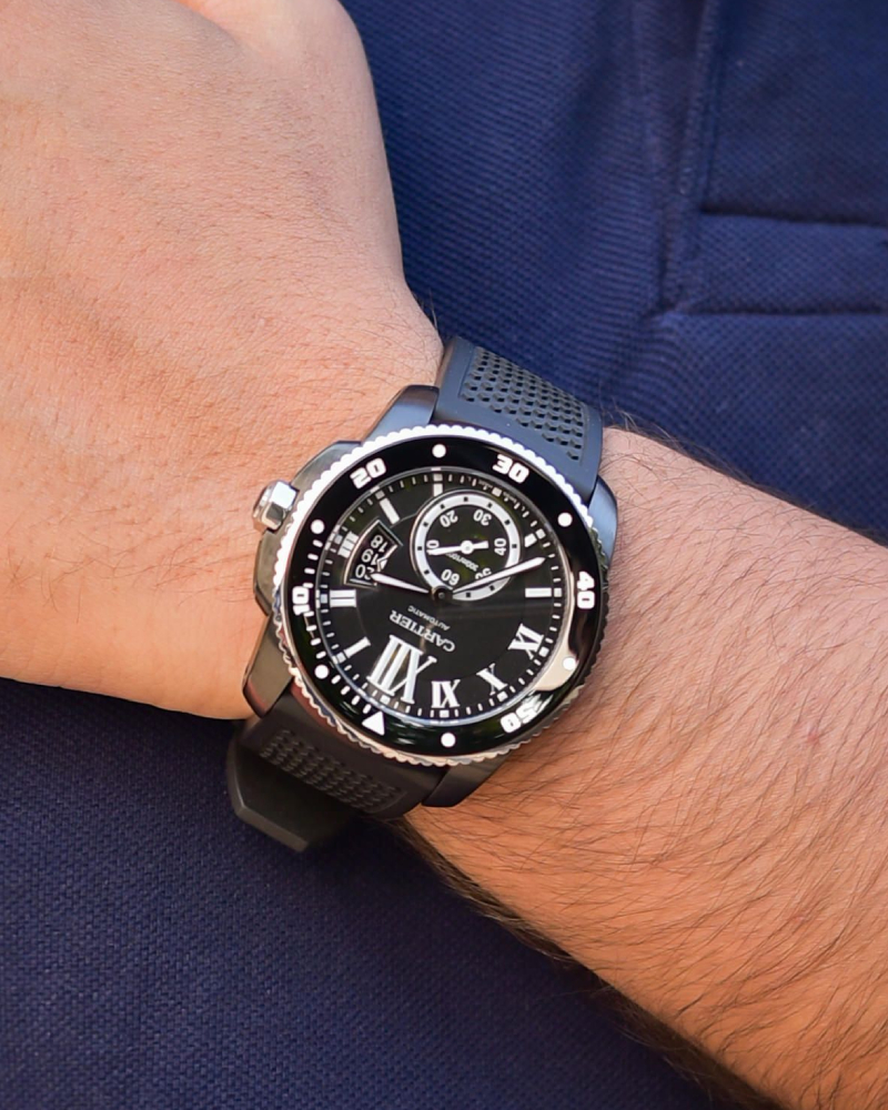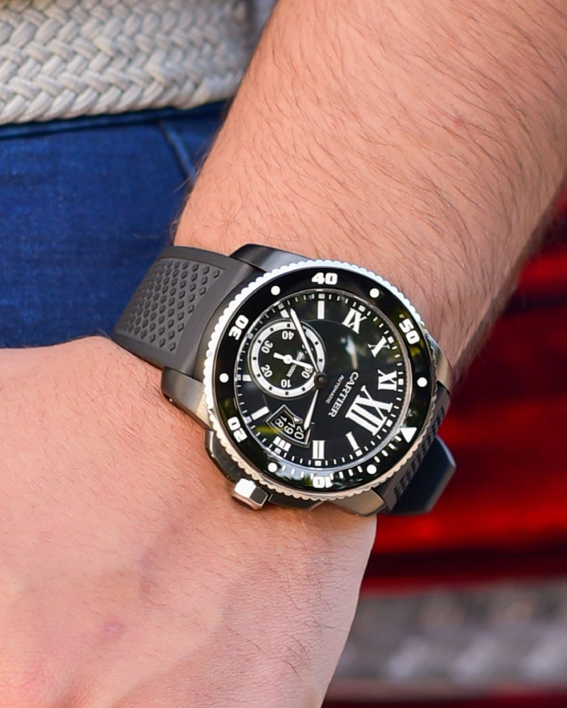 Часы Calibre de Cartier Diver Carbone, механизм с автоматическим подзаводом, калибр 1904-PS MC. Корпус из стали с ADLC-покрытием, ободок из стали с ADLC-покрытием, индикатор с покрытием Super-LumiNova*, граненая заводная головка украшена граненой синтетической шпинелью. Черный циферблат, частично покрытый спиралевидным узором, индикаторы с покрытием Super-LumiNova*, стрелки в форме мечей из стали с покрытием Super-LumiNova*. Сапфировое стекло. Браслет из каучука, стандартная застежка из стали с ADLC-покрытием. Размеры корпуса: диаметр 42 мм, высота 11 мм. Водонепроницаемость до 30 бар (300 метров). (*Торговая марка Super-LumiNova не принадлежит Cartier.)