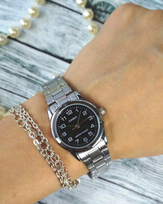 Предлагаем купить наручные часы Casio LTP-V001D-1B в г. Москва. Это классические женские часы из коллекции Collection Women. Водозащита до 30 метров позволит защитить корпус от случайных брызг или капель дождя. Надежное минеральное стекло защищает часы от царапин и долго сохраняет первоначальный внешний вид. Минеральное стекло более устойчиво к появлению небольших царапин и потертостей, хорошо может выдержать небольшие удары и падения. Даже если поцарапаете стекло, его легко можно отполировать в часовой мастерской и вернуть им прежний вид. Корпус часов изготовлен из стали, механизм — кварц. Кварцевые часы всегда точнее механических. В среднем, погрешность хода составляет 20 секунд в месяц. Кварцевые часы не нужно заводить, только менять батарейку раз в несколько лет.