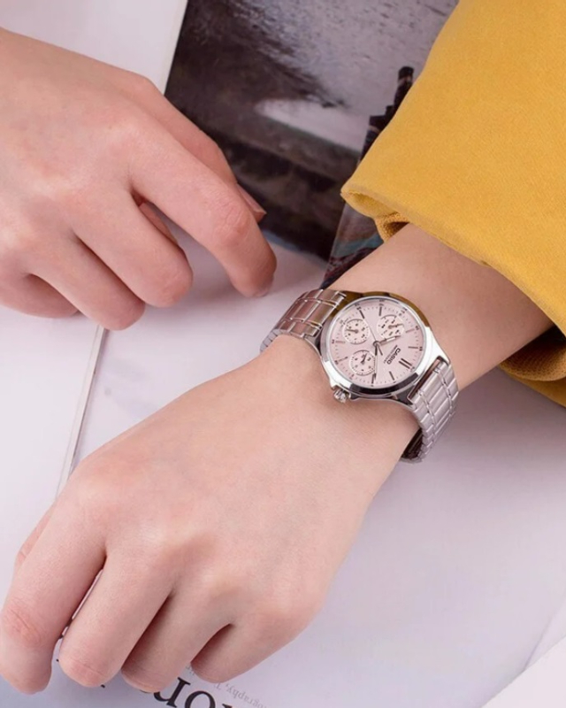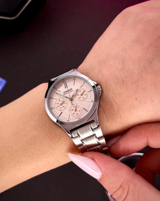 Предлагаем купить наручные часы Casio LTP-V300D-4A в г. Москва. Это женские часы из коллекции Collection Women. Водозащита до 30 метров позволит защитить корпус от случайных брызг или капель дождя. Надежное минеральное стекло защищает часы от царапин и долго сохраняет первоначальный внешний вид. Минеральное стекло более устойчиво к появлению небольших царапин и потертостей, хорошо может выдержать небольшие удары и падения. Даже если поцарапаете стекло, его легко можно отполировать в часовой мастерской и вернуть им прежний вид. Корпус часов изготовлен из стали, механизм — кварц. Кварцевые часы всегда точнее механических. В среднем, погрешность хода составляет 20 секунд в месяц. Кварцевые часы не нужно заводить, только менять батарейку раз в несколько лет.