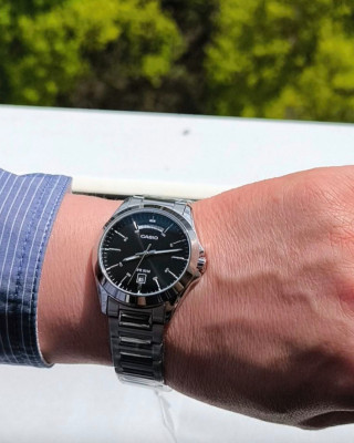 Предлагаем купить наручные часы Casio MTP-1370D-1A1 в г. Москва. Это мужские часы из коллекции Collection Men. Водозащита до 50 метров позволит принимать душ или умываться, не снимая часов. Надежное минеральное стекло защищает часы от царапин и долго сохраняет первоначальный внешний вид. Минеральное стекло более устойчиво к появлению небольших царапин и потертостей, хорошо может выдержать небольшие удары и падения. Даже если поцарапаете стекло, его легко можно отполировать в часовой мастерской и вернуть им прежний вид. Корпус часов изготовлен из стали, механизм — кварц. Кварцевые часы всегда точнее механических. В среднем, погрешность хода составляет 20 секунд в месяц. Кварцевые часы не нужно заводить, только менять батарейку раз в несколько лет.