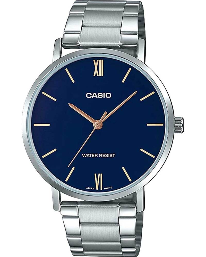 Предлагаем купить наручные часы Casio MTP-VT01D-2B в г. Москва. Это мужские часы из коллекции Collection Men. Водозащита до 30 метров позволит защитить корпус от случайных брызг или капель дождя. Надежное минеральное стекло защищает часы от царапин и долго сохраняет первоначальный внешний вид. Минеральное стекло более устойчиво к появлению небольших царапин и потертостей, хорошо может выдержать небольшие удары и падения. Даже если поцарапаете стекло, его легко можно отполировать в часовой мастерской и вернуть им прежний вид. Корпус часов изготовлен из стали, механизм — кварц. Кварцевые часы всегда точнее механических. В среднем, погрешность хода составляет 20 секунд в месяц. Кварцевые часы не нужно заводить, только менять батарейку раз в несколько лет.