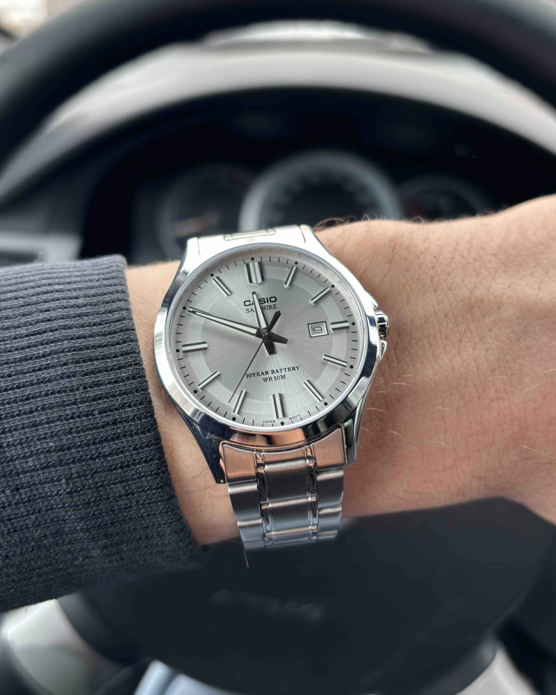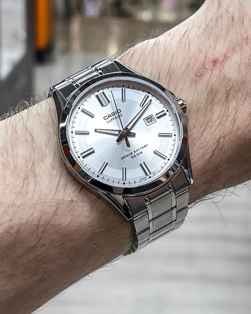 Предлагаем купить наручные часы Casio MTS-100D-7A в г. Москва. Это классические мужские часы из коллекции Collection Men. Водозащита до 50 метров позволит принимать душ или умываться, не снимая часов. Надежное сапфировое стекло противостоит появлению царапин. Сапфировое стекло используется в дорогостоящих изделиях, это лучшее стекло для наручных часов, которое не царапается при механическом воздействии, его можно повредить только алмазом. Корпус часов изготовлен из стали, механизм — кварц. Кварцевые часы всегда точнее механических. В среднем, погрешность хода составляет 20 секунд в месяц. Кварцевые часы не нужно заводить, только менять батарейку раз в несколько лет.
