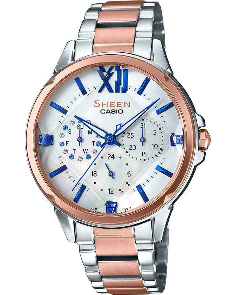 Предлагаем купить наручные часы Casio SHE-3056SPG-7AUER в г. Москва. Это классические женские часы из коллекции SHEEN. Водозащита до 50 метров позволит принимать душ или умываться, не снимая часов. Надежное минеральное стекло защищает часы от царапин и долго сохраняет первоначальный внешний вид. Минеральное стекло более устойчиво к появлению небольших царапин и потертостей, хорошо может выдержать небольшие удары и падения. Даже если поцарапаете стекло, его легко можно отполировать в часовой мастерской и вернуть им прежний вид. Корпус часов изготовлен из стали, механизм — кварц. Кварцевые часы всегда точнее механических. В среднем, погрешность хода составляет 20 секунд в месяц. Кварцевые часы не нужно заводить, только менять батарейку раз в несколько лет.