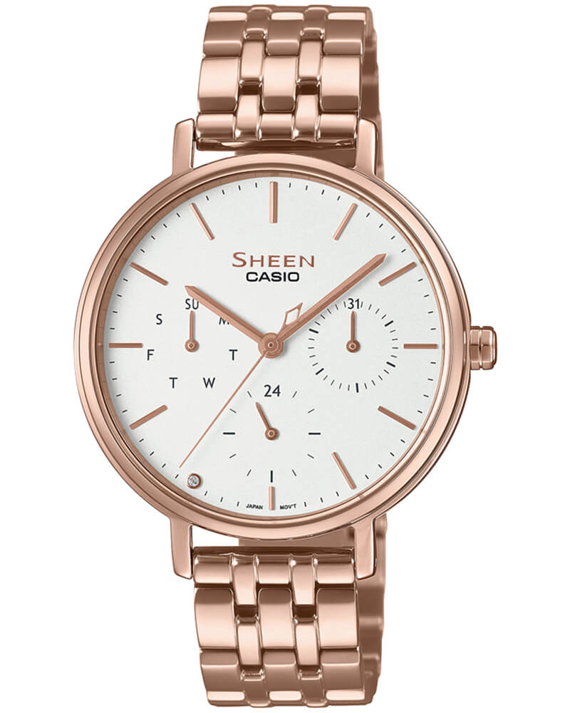 Предлагаем купить наручные часы Casio SHE-4541CG-7AUDF в г. Москва. Это женские часы из коллекции SHEEN. Водозащита до 50 метров позволит принимать душ или умываться, не снимая часов. Надежное сапфировое стекло противостоит появлению царапин. Сапфировое стекло используется в дорогостоящих изделиях, это лучшее стекло для наручных часов, которое не царапается при механическом воздействии, его можно повредить только алмазом. Корпус часов изготовлен из стали, механизм — кварц. Кварцевые часы всегда точнее механических. В среднем, погрешность хода составляет 20 секунд в месяц. Кварцевые часы не нужно заводить, только менять батарейку раз в несколько лет.