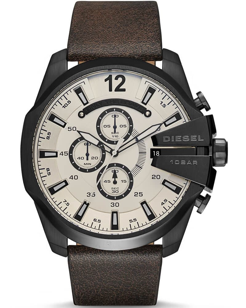 Предлагаем купить наручные часы Diesel DZ4422 в г. Москва. Это мужские часы из коллекции Mega Chief. Водозащита до 100 метров позволит плавать, нырять и заниматься другими водными видами спорта, не беспокоясь о сохранности механизма. Надежное минеральное стекло защищает часы от царапин и долго сохраняет первоначальный внешний вид. Минеральное стекло более устойчиво к появлению небольших царапин и потертостей, хорошо может выдержать небольшие удары и падения. Даже если поцарапаете стекло, его легко можно отполировать в часовой мастерской и вернуть им прежний вид. Корпус часов изготовлен из стали, механизм — кварц. Кварцевые часы всегда точнее механических. В среднем, погрешность хода составляет 20 секунд в месяц. Кварцевые часы не нужно заводить, только менять батарейку раз в несколько лет.