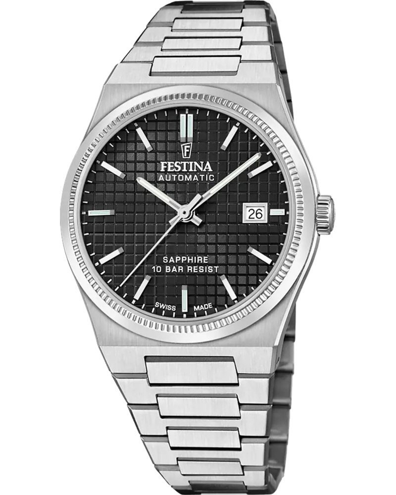 Предлагаем купить наручные часы Festina F20028/4 в г. Москва. Это классические мужские часы из коллекции Swiss Made. Водозащита до 100 метров позволит плавать, нырять и заниматься другими водными видами спорта, не беспокоясь о сохранности механизма. Надежное сапфировое стекло противостоит появлению царапин. Сапфировое стекло используется в дорогостоящих изделиях, это лучшее стекло для наручных часов, которое не царапается при механическом воздействии, его можно повредить только алмазом. Корпус часов изготовлен из стали, механизм — автоподзавод. В часах с автоподзаводом заводная головка практически не используется, что исключает истирание ее материала и материала корпуса (зазор между ними остается постоянным – это препятствует попаданию внутрь влаги, пыли, грязи).