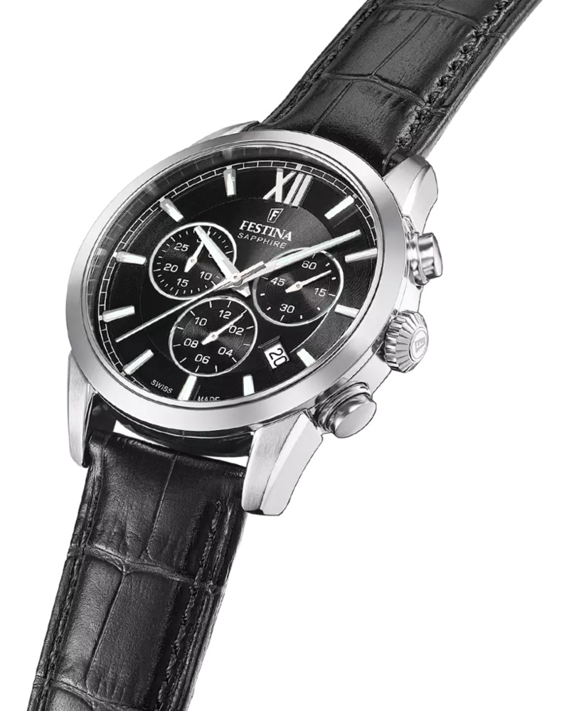 Предлагаем купить наручные часы Festina F20041/4 в г. Москва. Это мужские часы из коллекции Swiss Made. Водозащита до 100 метров позволит плавать, нырять и заниматься другими водными видами спорта, не беспокоясь о сохранности механизма. Надежное сапфировое стекло противостоит появлению царапин. Сапфировое стекло используется в дорогостоящих изделиях, это лучшее стекло для наручных часов, которое не царапается при механическом воздействии, его можно повредить только алмазом. Корпус часов изготовлен из стали, механизм — кварц. Кварцевые часы всегда точнее механических. В среднем, погрешность хода составляет 20 секунд в месяц. Кварцевые часы не нужно заводить, только менять батарейку раз в несколько лет.