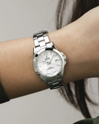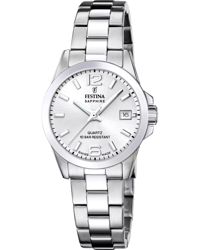 Предлагаем купить наручные часы Festina F20049/1 в г. Москва. Это классические женские часы из коллекции Swiss Made. Водозащита до 100 метров позволит плавать, нырять и заниматься другими водными видами спорта, не беспокоясь о сохранности механизма. Надежное сапфировое стекло противостоит появлению царапин. Сапфировое стекло используется в дорогостоящих изделиях, это лучшее стекло для наручных часов, которое не царапается при механическом воздействии, его можно повредить только алмазом. Корпус часов изготовлен из стали, механизм — кварц. Кварцевые часы всегда точнее механических. В среднем, погрешность хода составляет 20 секунд в месяц. Кварцевые часы не нужно заводить, только менять батарейку раз в несколько лет.