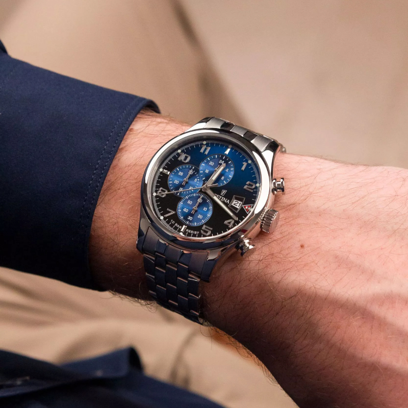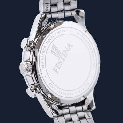 Предлагаем купить наручные часы Festina F20374/8 в г. Москва. Это мужские часы из коллекции Timeless Chronograph. Водозащита до 100 метров позволит плавать, нырять и заниматься другими водными видами спорта, не беспокоясь о сохранности механизма. Надежное минеральное стекло защищает часы от царапин и долго сохраняет первоначальный внешний вид. Минеральное стекло более устойчиво к появлению небольших царапин и потертостей, хорошо может выдержать небольшие удары и падения. Даже если поцарапаете стекло, его легко можно отполировать в часовой мастерской и вернуть им прежний вид. Корпус часов изготовлен из стали, механизм — кварц. Кварцевые часы всегда точнее механических. В среднем, погрешность хода составляет 20 секунд в месяц. Кварцевые часы не нужно заводить, только менять батарейку раз в несколько лет.