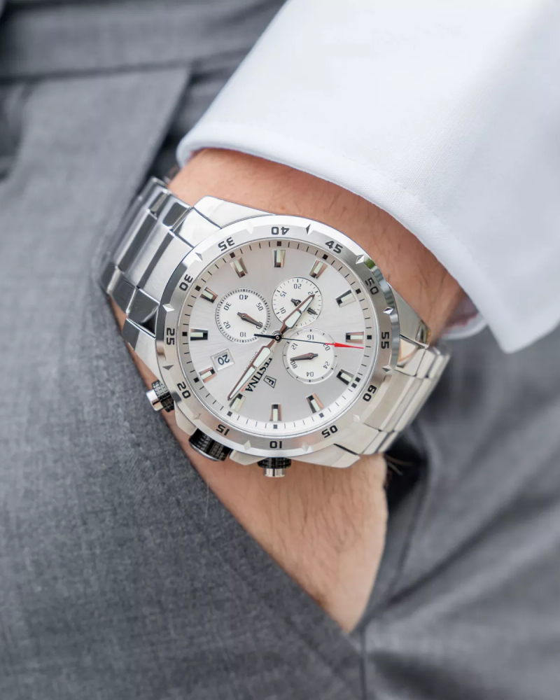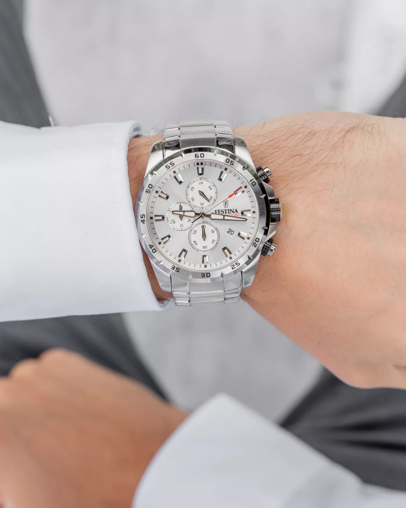 Предлагаем купить наручные часы Festina F20463/1 в г. Москва. Это мужские часы из коллекции Chrono Sport. Водозащита до 100 метров позволит плавать, нырять и заниматься другими водными видами спорта, не беспокоясь о сохранности механизма. Надежное минеральное стекло защищает часы от царапин и долго сохраняет первоначальный внешний вид. Минеральное стекло более устойчиво к появлению небольших царапин и потертостей, хорошо может выдержать небольшие удары и падения. Даже если поцарапаете стекло, его легко можно отполировать в часовой мастерской и вернуть им прежний вид. Корпус часов изготовлен из стали, механизм — кварц. Кварцевые часы всегда точнее механических. В среднем, погрешность хода составляет 20 секунд в месяц. Кварцевые часы не нужно заводить, только менять батарейку раз в несколько лет.