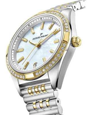 Предлагаем купить наручные часы Jacques Philippe JPQLS687388YG в г. Москва. Это женские часы из коллекции Radiante. Водозащита до 50 метров позволит принимать душ или умываться, не снимая часов. Надежное сапфировое стекло противостоит появлению царапин. Сапфировое стекло используется в дорогостоящих изделиях, это лучшее стекло для наручных часов, которое не царапается при механическом воздействии, его можно повредить только алмазом. Корпус часов изготовлен из стали, механизм — кварц. Кварцевые часы всегда точнее механических. В среднем, погрешность хода составляет 20 секунд в месяц. Кварцевые часы не нужно заводить, только менять батарейку раз в несколько лет.