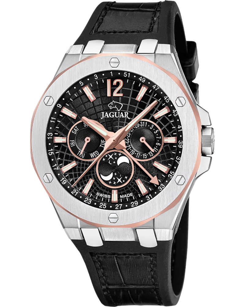 Предлагаем купить наручные часы Jaguar J1040/4 в г. Москва. Это мужские часы из коллекции JAG 2025 Moonphase. Водозащита до 100 метров позволит плавать, нырять и заниматься другими водными видами спорта, не беспокоясь о сохранности механизма. Надежное сапфировое стекло противостоит появлению царапин. Сапфировое стекло используется в дорогостоящих изделиях, это лучшее стекло для наручных часов, которое не царапается при механическом воздействии, его можно повредить только алмазом. Корпус часов изготовлен из стали, механизм — кварц. Кварцевые часы всегда точнее механических. В среднем, погрешность хода составляет 20 секунд в месяц. Кварцевые часы не нужно заводить, только менять батарейку раз в несколько лет.