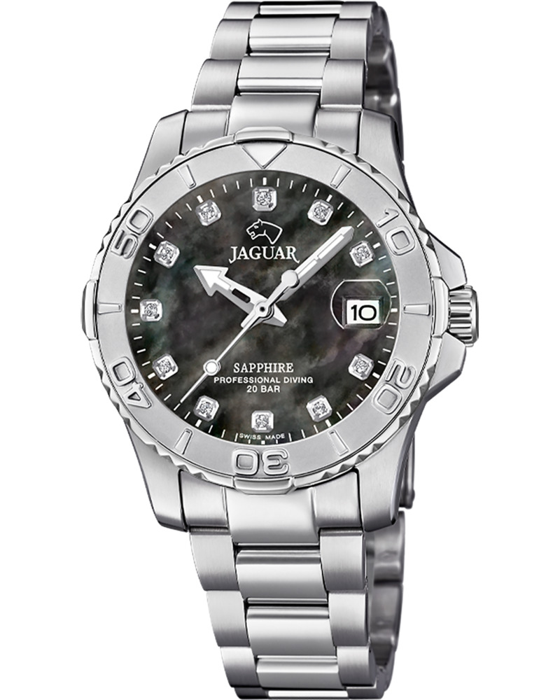 Предлагаем купить наручные часы Jaguar J870/5 в г. Москва. Это женские часы из коллекции Couple Diver. Водозащита до 200 метров позволит плавать, нырять и погружаться под воду с аквалангом. Надежное сапфировое стекло противостоит появлению царапин. Сапфировое стекло используется в дорогостоящих изделиях, это лучшее стекло для наручных часов, которое не царапается при механическом воздействии, его можно повредить только алмазом. Корпус часов изготовлен из стали, механизм — кварц. Кварцевые часы всегда точнее механических. В среднем, погрешность хода составляет 20 секунд в месяц. Кварцевые часы не нужно заводить, только менять батарейку раз в несколько лет.