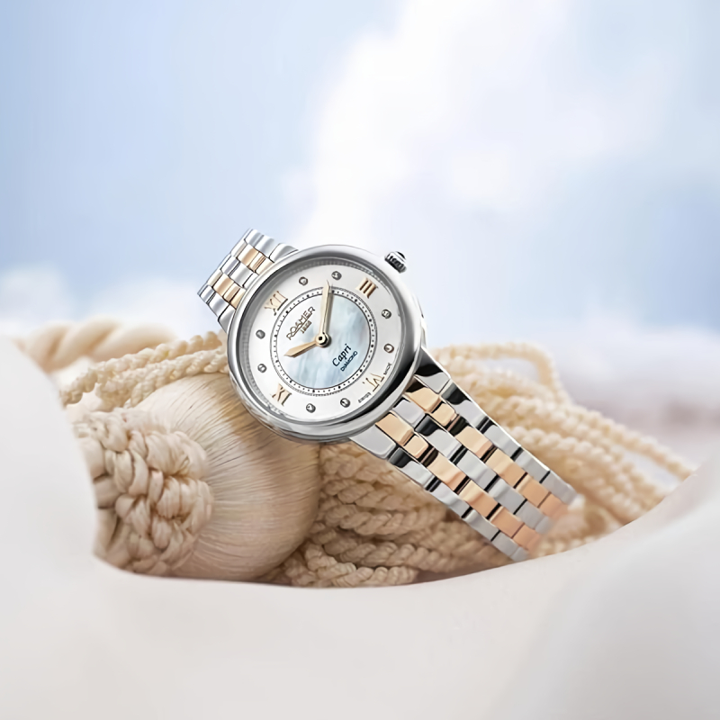 Предлагаем купить наручные часы Roamer 859 845 49 29 50 в г. Москва. Это женские часы из коллекции Capri Diamond. Водозащита до 50 метров позволит принимать душ или умываться, не снимая часов. Надежное сапфировое стекло противостоит появлению царапин. Сапфировое стекло используется в дорогостоящих изделиях, это лучшее стекло для наручных часов, которое не царапается при механическом воздействии, его можно повредить только алмазом. Корпус часов изготовлен из стали, механизм — кварц. Кварцевые часы всегда точнее механических. В среднем, погрешность хода составляет 20 секунд в месяц. Кварцевые часы не нужно заводить, только менять батарейку раз в несколько лет.