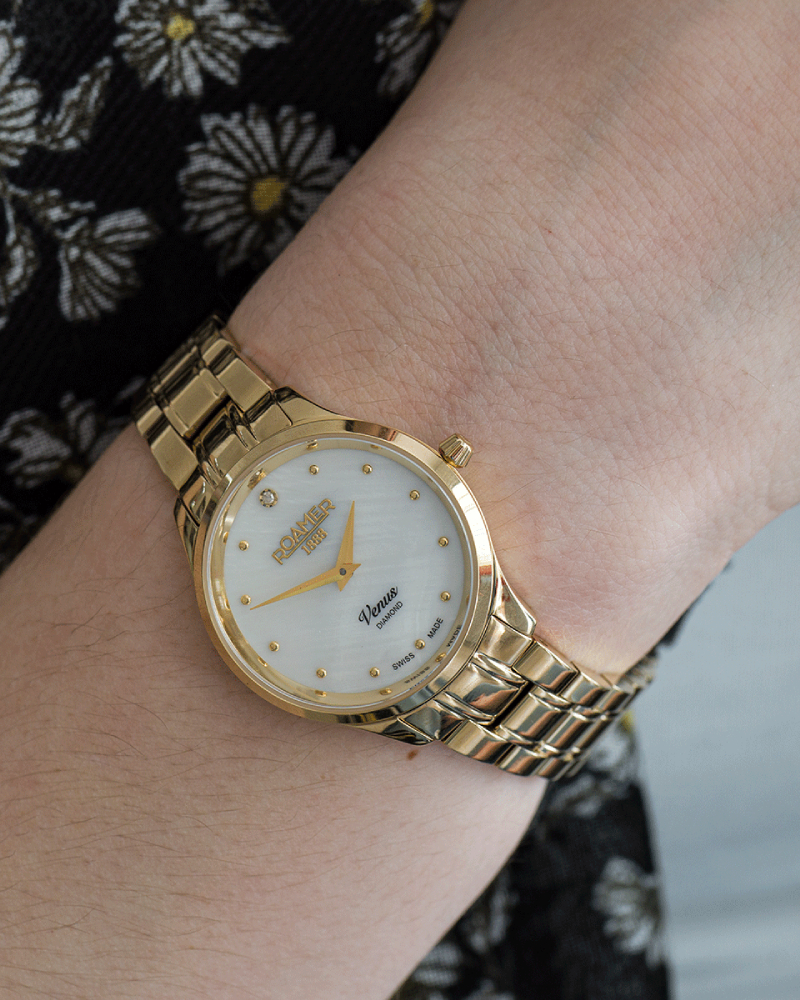 Предлагаем купить наручные часы Roamer 601 857 48 89 20 в г. Москва. Это классические женские часы из коллекции Venus Diamond. Водозащита до 50 метров позволит принимать душ или умываться, не снимая часов. Надежное сапфировое стекло противостоит появлению царапин. Сапфировое стекло используется в дорогостоящих изделиях, это лучшее стекло для наручных часов, которое не царапается при механическом воздействии, его можно повредить только алмазом. Корпус часов изготовлен из стали, механизм — кварц. Кварцевые часы всегда точнее механических. В среднем, погрешность хода составляет 20 секунд в месяц. Кварцевые часы не нужно заводить, только менять батарейку раз в несколько лет.