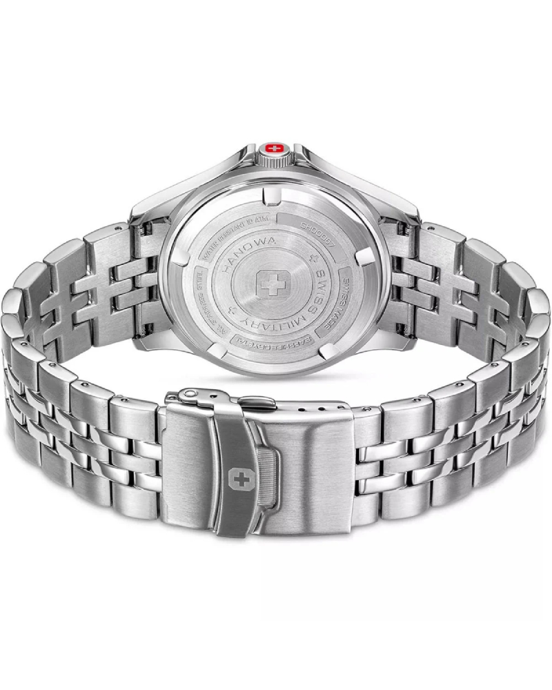 Предлагаем купить наручные часы Swiss Military Hanowa SMWGH0006704 в г. Москва. Это классические мужские часы. Водозащита до 100 метров позволит плавать, нырять и заниматься другими водными видами спорта, не беспокоясь о сохранности механизма. Надежное сапфировое стекло противостоит появлению царапин. Сапфировое стекло используется в дорогостоящих изделиях, это лучшее стекло для наручных часов, которое не царапается при механическом воздействии, его можно повредить только алмазом. Корпус часов изготовлен из стали, механизм — кварц. Кварцевые часы всегда точнее механических. В среднем, погрешность хода составляет 20 секунд в месяц. Кварцевые часы не нужно заводить, только менять батарейку раз в несколько лет.