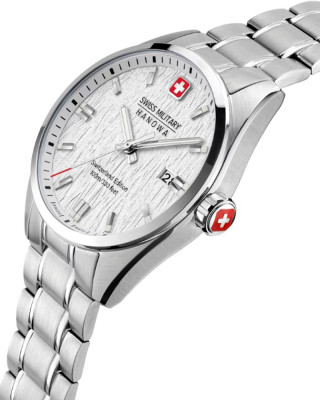 Предлагаем купить наручные часы Swiss Military Hanowa SMWGH0004601 в г. Москва. Это мужские часы из коллекции Helvetica. Водозащита до 100 метров позволит плавать, нырять и заниматься другими водными видами спорта, не беспокоясь о сохранности механизма. Надежное сапфировое стекло противостоит появлению царапин. Сапфировое стекло используется в дорогостоящих изделиях, это лучшее стекло для наручных часов, которое не царапается при механическом воздействии, его можно повредить только алмазом. Корпус часов изготовлен из стали, механизм — кварц. Кварцевые часы всегда точнее механических. В среднем, погрешность хода составляет 20 секунд в месяц. Кварцевые часы не нужно заводить, только менять батарейку раз в несколько лет.