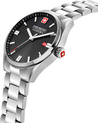 Предлагаем купить наручные часы Swiss Military Hanowa SMWGH2200101 в г. Москва. Это мужские часы из коллекции Roadrunner. Водозащита до 100 метров позволит плавать, нырять и заниматься другими водными видами спорта, не беспокоясь о сохранности механизма. Надежное сапфировое стекло противостоит появлению царапин. Сапфировое стекло используется в дорогостоящих изделиях, это лучшее стекло для наручных часов, которое не царапается при механическом воздействии, его можно повредить только алмазом. Корпус часов изготовлен из стали, механизм — кварц. Кварцевые часы всегда точнее механических. В среднем, погрешность хода составляет 20 секунд в месяц. Кварцевые часы не нужно заводить, только менять батарейку раз в несколько лет.