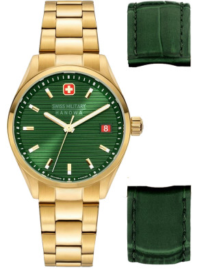 Предлагаем купить наручные часы Swiss Military Hanowa SMWGH2200112-SET в г. Москва. Это классические мужские часы из коллекции Roadrunner. Водозащита до 100 метров позволит плавать, нырять и заниматься другими водными видами спорта, не беспокоясь о сохранности механизма. Надежное сапфировое стекло противостоит появлению царапин. Сапфировое стекло используется в дорогостоящих изделиях, это лучшее стекло для наручных часов, которое не царапается при механическом воздействии, его можно повредить только алмазом. Корпус часов изготовлен из стали, механизм — кварц. Кварцевые часы всегда точнее механических. В среднем, погрешность хода составляет 20 секунд в месяц. Кварцевые часы не нужно заводить, только менять батарейку раз в несколько лет.