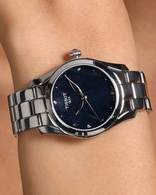Швейцарские часы из коллекции T-Lady, как изящный аксессуар, подойдут к любому наряду: они способны освежить повседневный образ и дополнить роскошное платье, выбранное по особому случаю. Стрелки в виде листьев привлекают внимание к лаконичному темно-синему циферблату, а четыре бриллианта на нем превращают часы Tissot T-Wave в настоящее произведение искусства.