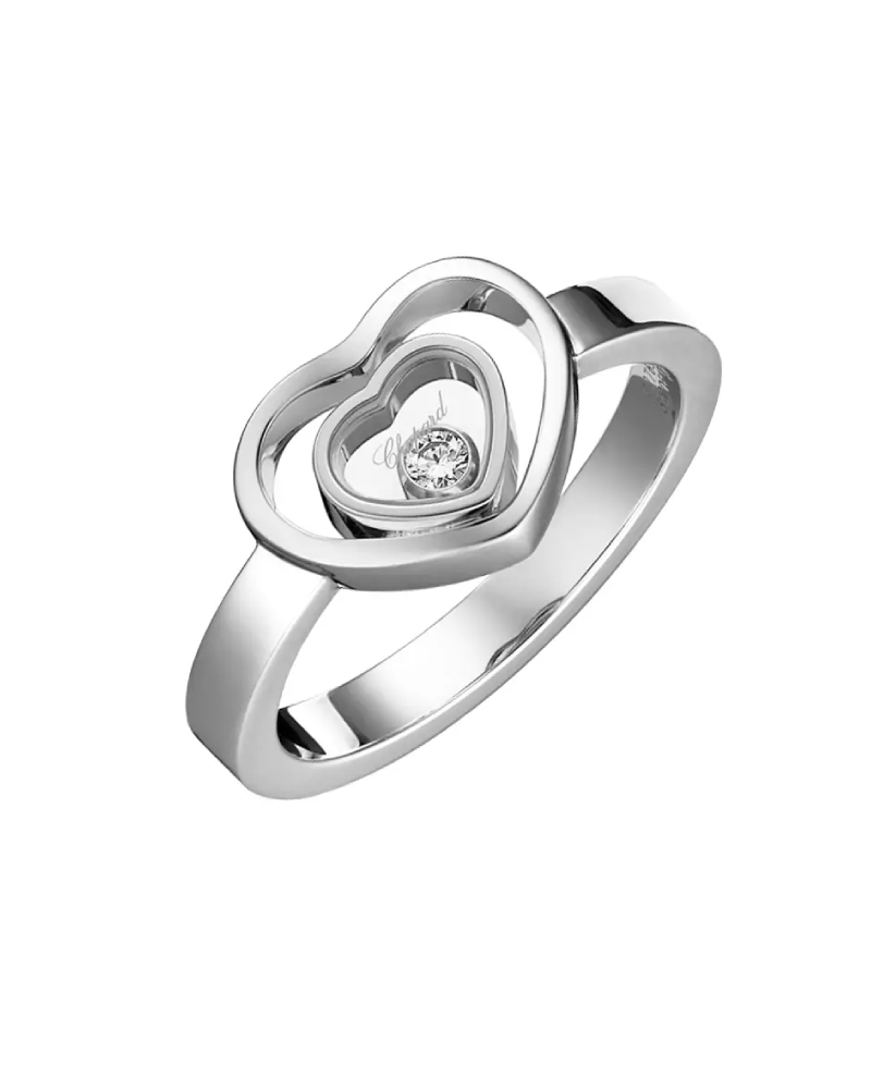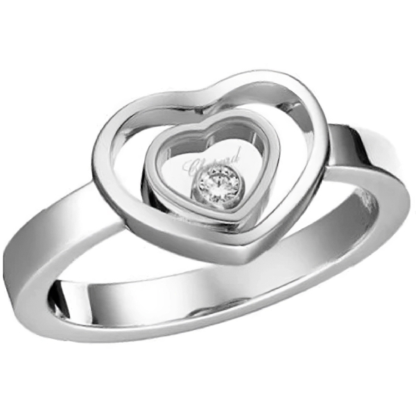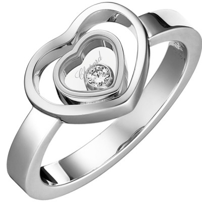 Happy Diamonds – знаковая линия уникальных и задорных украшений. Танцующие бриллианты порхают между сапфировыми стеклами в свободном полете, усиливающем их внутренний блеск. В кольцо из белого золота 750-й пробы включены декоративные элементы в форме двух сердец, внутри сердца меньшего размера свободно скользит подвижный бриллиант, расцвечивая своим радостным сиянием каждый момент жизни. Эта уникальное кольцо - прекрасный подарок, олицетворяющий гармонию и элегантность.