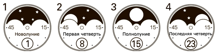 Теперь воспользуйтесь лунным календарем, чтобы узнать, в какой день было последнее полнолуние. Рассчитайте разницу с сегодняшней датой. Нажмите кнопку указанное количество раз. После этого отображение Луны будет установлено правильно. Предположим, последнее полнолуние было 16.07, часы нужно установить на 06.08. С последнего полнолуния прошло 22 дня. Значит, нужно нажать кнопку 22 раза.