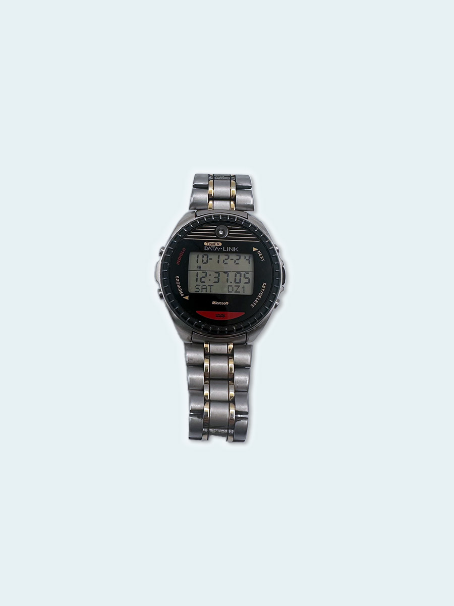 Есть в коллекции и часы, плод сотрудничества Timex и Microsoft 1994 года. Datalink 50 — один из ранних экспериментов со смарт часами. Наручные компьютеры предлагались в качестве дополнения к обычным компьютерам с дополнительной водонепроницаемостью и простым интерфейсом. Первые часы, способные загружать информацию с компьютера по беспроводной сети. Вот несколько примеров приложений, которые можно было загрузить на умные часы: простой хронограф (секундомер), номера телефонов, блокнот, в котором можно было сохранить до 40 слов, и клон Space Invaders. В устройстве еще не было Wi-Fi или Bluetooth, но применялся оптический датчик с линзой, который считывал информацию с ПК. Чтобы загрузить данные, нужно было поднести часы к электронно-лучевой трубке монитора, на котором отображался узор из мигающих черно-белых полос.