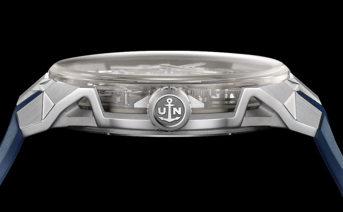 Внутри Free Wheel Maillechort бьется мануфактурный калибр UN-176 с ручным заводом, всего в нем 257 деталей. Калибр оснащен кремниевым спуском и балансом, который обеспечивает высокую точность и устойчивость к влиянию магнитного поля. Запас хода составляет 170 часов — впечатляющий показатель для часов с ручным заводом! Остаток завода всегда можно проверить по индикатору в положении 4 часов. В отличие от традиционных моделей, индикатор остается статичным, в то время как отображающий диск движется: три полосы сигнализируют о полной мощности, одна — предупреждает о скором истощении.