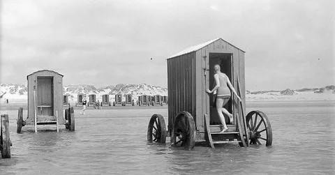 В этот период появились первые купальные машины — деревянные кабинки на колесах, в которых можно было не только приватно сменить костюм, но и искупаться. Купальники того времени были громоздкими и закрытыми, ценой удобства скрывающими тело от посторонних глаз. Женщины носили длинные платья и панталоны, а мужчины — шерстяные костюмы, закрывающие все тело.