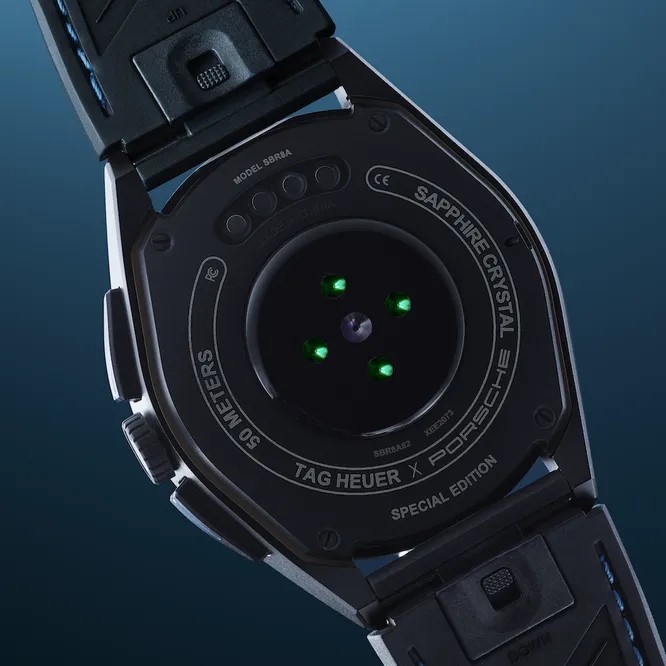 Это высокотехнологичное устройство, которое предлагает широкий спектр функций, включая GPS-навигацию, мониторинг сердечного ритма, уведомления о звонках и сообщениях, а также возможность оплаты покупок с помощью Google Pay. Информация об автомобиле отображается прямо на циферблате. На титановой задней крышке корпуса часов можно увидеть светодиодный датчик частоты пульса, используемый для фитнес-функций, вокруг него выгравирована надпись «TAG Heuer x Porsche».