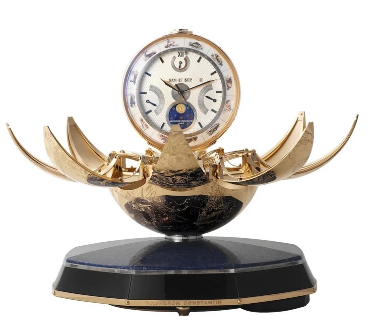 Вспомним роскошные настольные часы L’Esprit des Cabinotiers, созданные в 2005 году в честь 250-летия Vacheron Constantin. Корпус выполнен в виде глобуса из розового золота. На внешней стороне вручную выгравирована карта неба, воспроизводящая положение звёзд 17 сентября 1755 года. На периферию циферблата нанесена шкала знаков Зодиака.