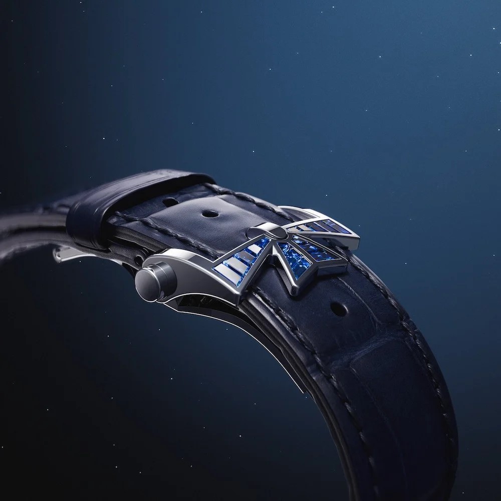 Ремешок также сделан роскошно: тёмно-синяя кожа аллигатора с соответствующей подкладкой, застежка из 18-каратного белого золота с дополнительными 16 сапфирами багетной огранки весом 0,53 карата.