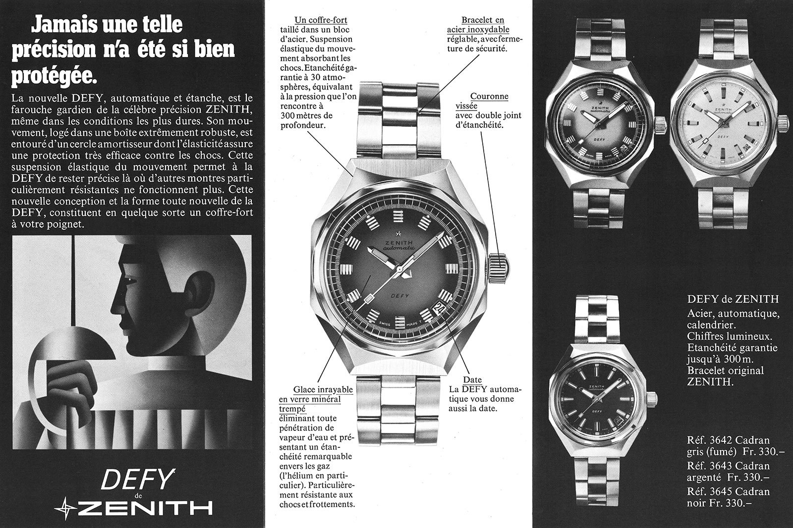 Первые модели Defy, выпущенные в 1969 году, отличались необычным восьмиугольным корпусом, прочной конструкцией и высокой устойчивостью к внешним воздействиям. Название Defy (в переводе — бросать вызов) отражало стремление Zenith создать часы, способные выдержать любые испытания. В этой модели впервые был представлен инновационный калибр El Primero. Он оказался настолько точным, что впоследствии механики Rolex использовали его для своих часов Daytona в течение нескольких лет.